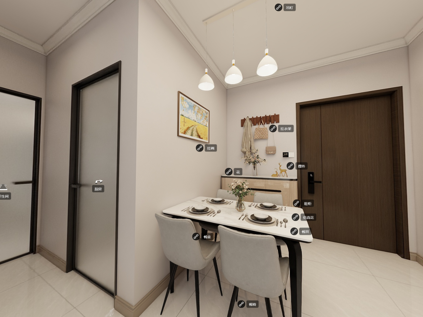 餐桌选用灰白配色的岩板材质,桌面平整无花纹,搭配细腿餐椅,纤细的线条弱化了家具的厚重感,让小空间更显通透。靠墙定制一组无把手的餐边柜,与墙面同色,视觉上融为一体,满足收纳需求的同时,保持了空间的整洁度。墙面不做过多装饰,仅在餐边柜上方挂一幅简约的几何画,点到为止,不破坏整体的简洁感。