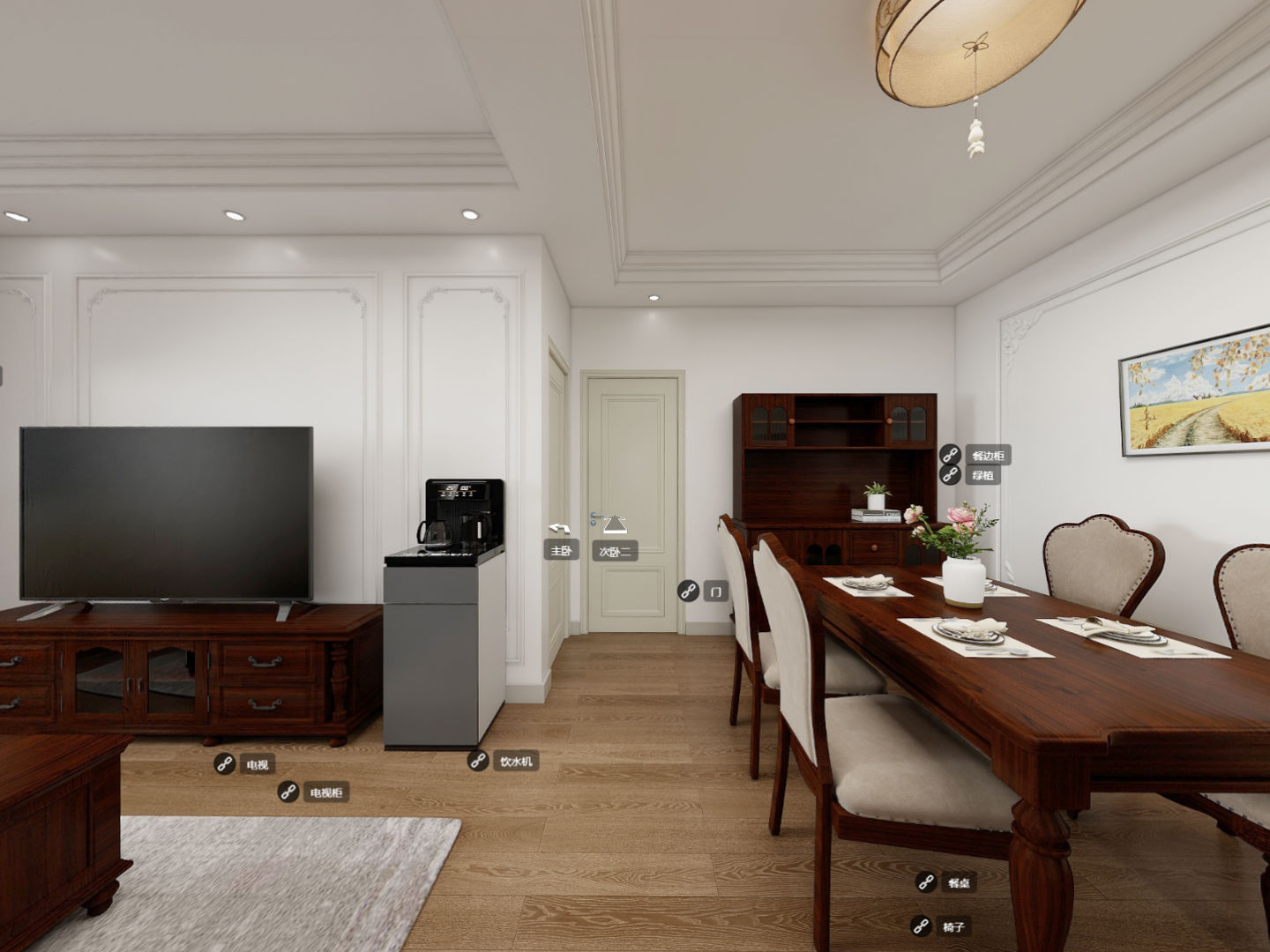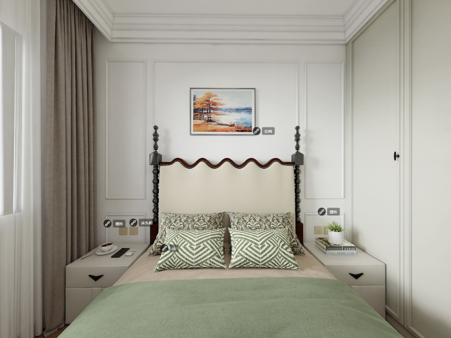 硬装以简洁线条(护墙板、吊顶造型)体现风格,避免冗余设计;