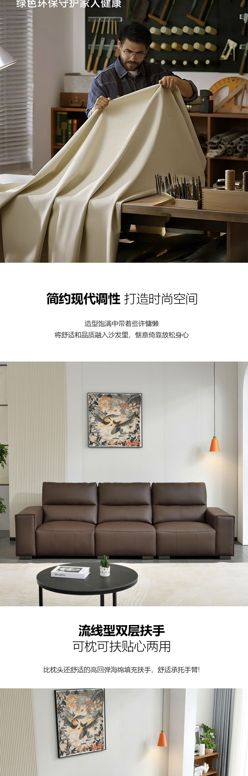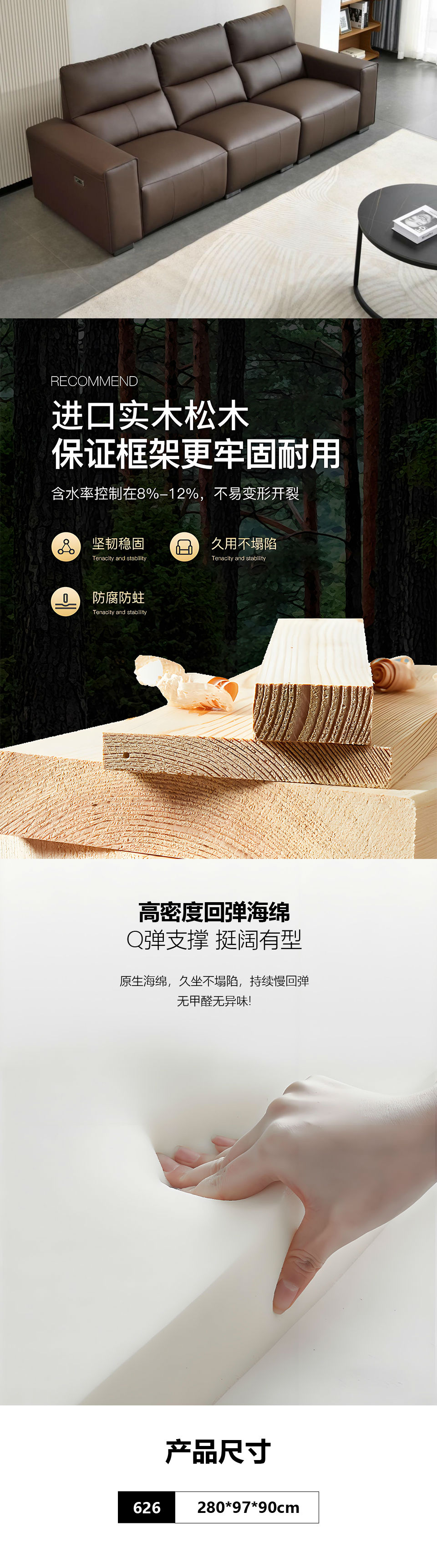 商品名称:626 现代风格 咖色生态皮头层牛皮沙发电动功能 时尚简约落叶松框架 高密度海绵 客厅家具 280*97*90