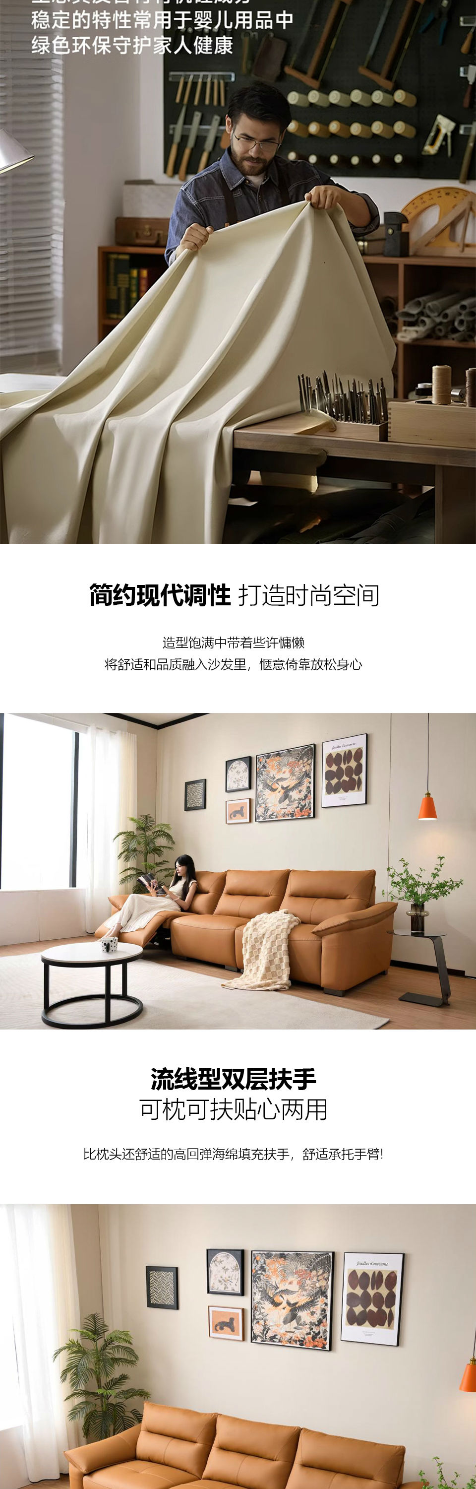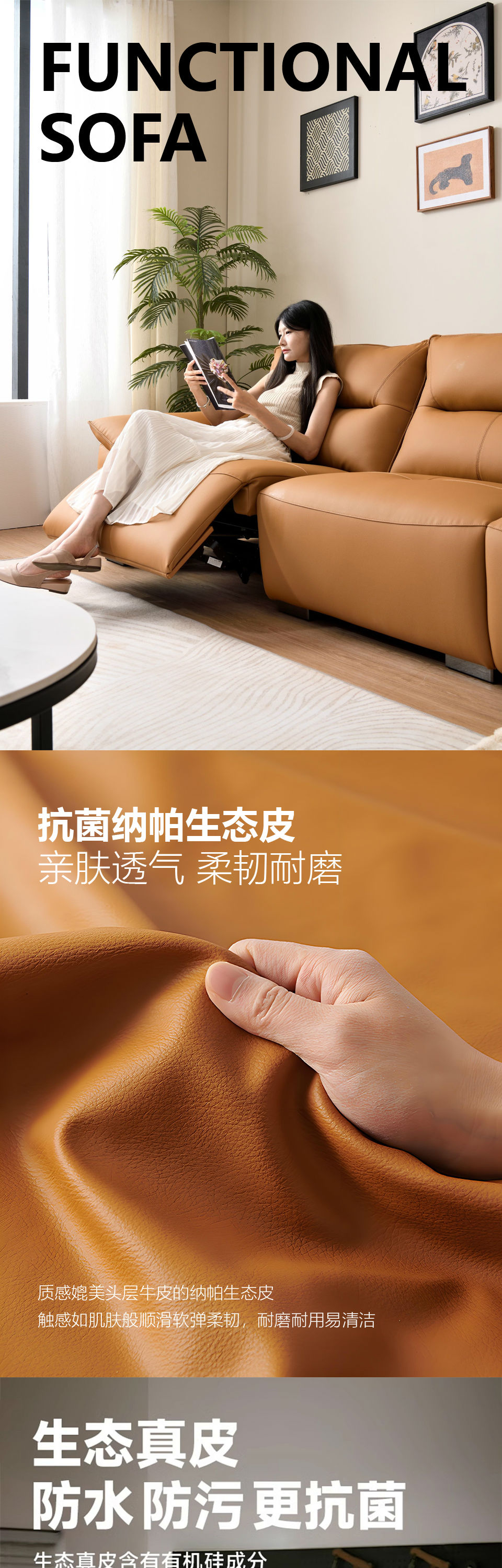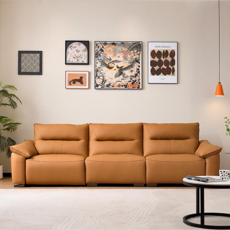 629 现代风格 橙色生态皮头层真皮沙发电动功能 时尚简约落叶松框架 高密度海绵 客厅家具 300*109*93