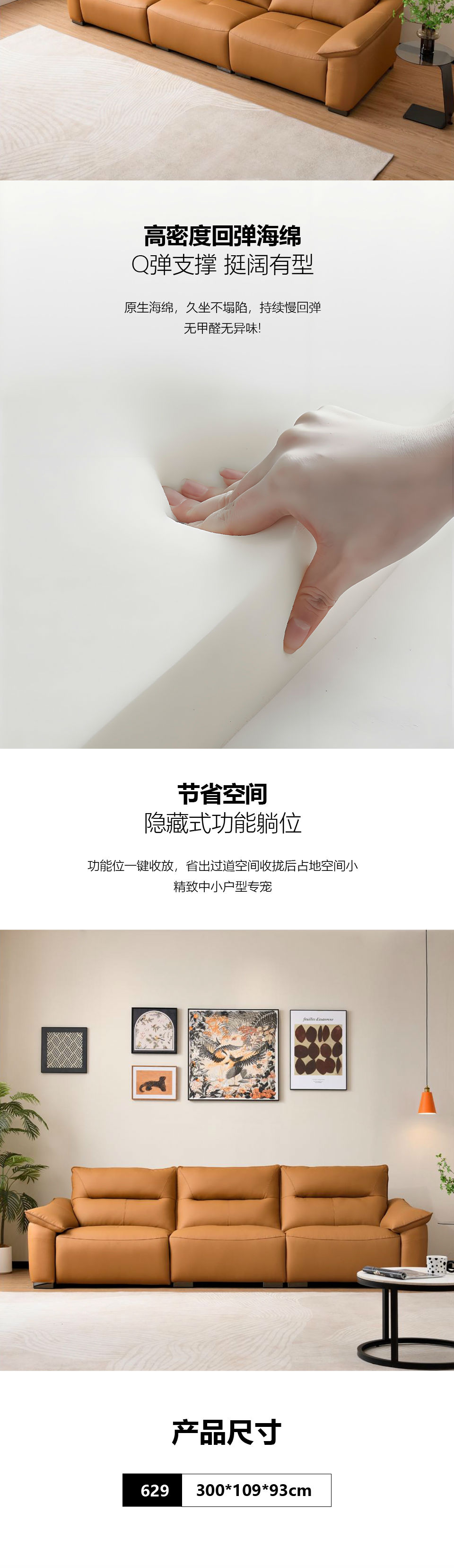 商品名称:629 现代风格 橙色生态皮头层真皮沙发电动功能 时尚简约落叶松框架 高密度海绵 客厅家具 300*109*93