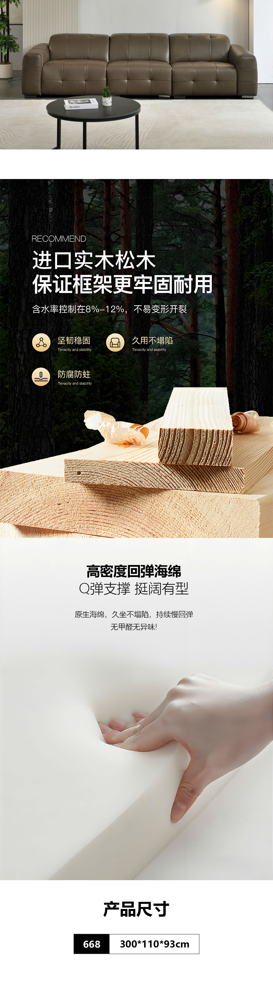 商品名称:668 现代风格 咖色生态皮沙发电动功能 时尚简约落叶松框架 高密度海绵 客厅家具 300*110*93