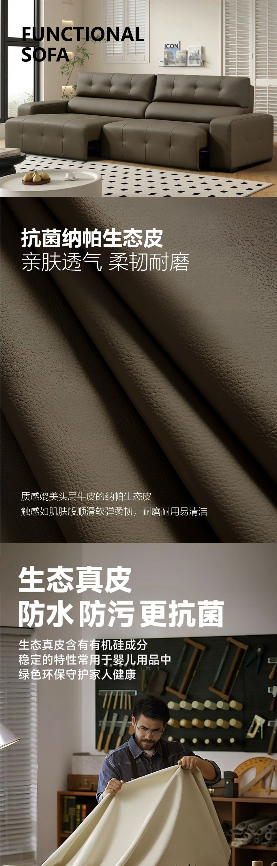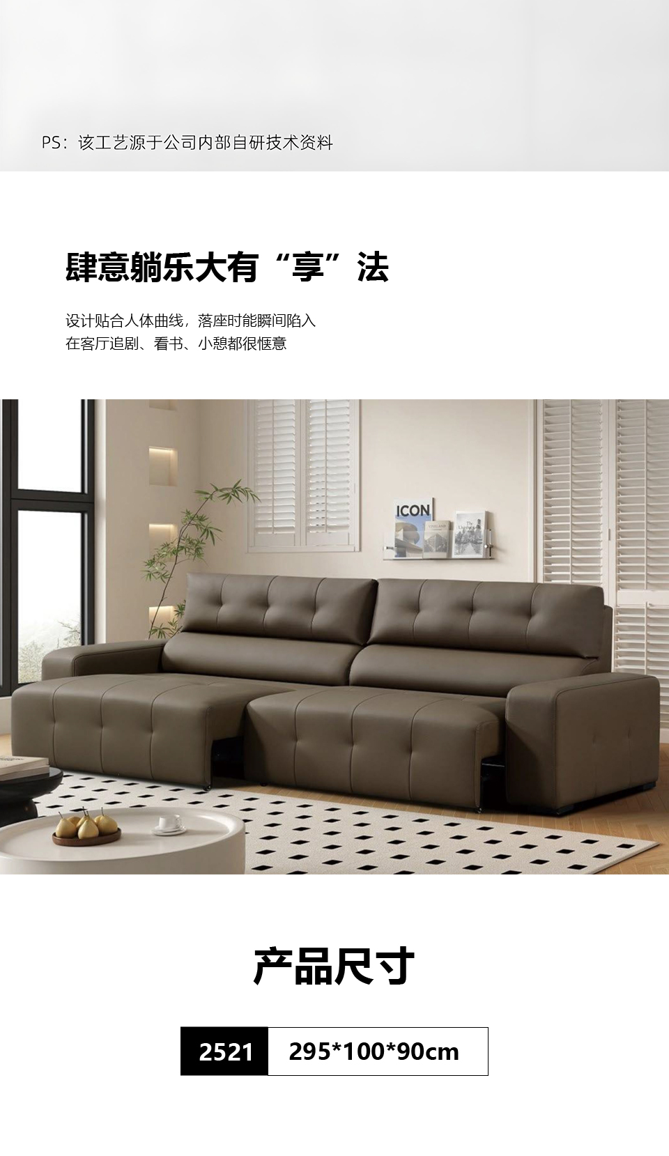 商品名称:2521 现代风格 咖色生态皮沙发电动功能 时尚简约落叶松框架 高密度海绵 客厅家具 295*100*90