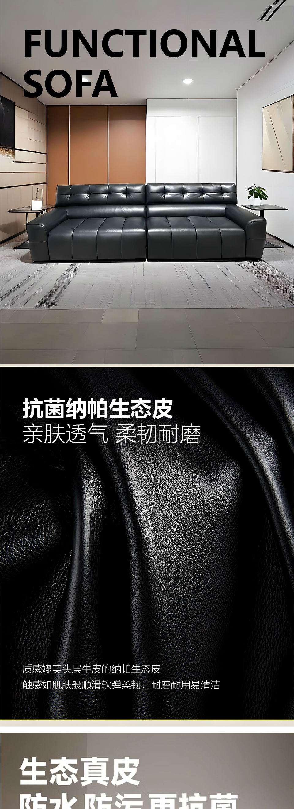 商品名称:2560 现代风格 黑色生态皮沙发电动功能 时尚简约落叶松框架 高密度海绵 客厅家具 303*100*90