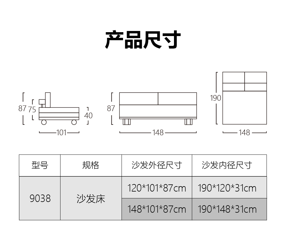 9038 现代风格 简约耐用客厅沙发床 客厅家具 1.2米/1.48米