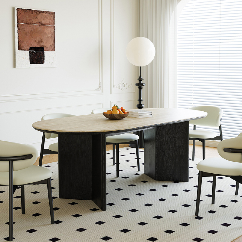 商品名称:FG--601V字餐桌FG-001#实木餐椅FG-002#实木餐椅 美式风格 实木家具 餐桌岩板橡胶木贴白蜡皮/餐椅实木+西皮软包 橡木+羊羔绒/橡木+绒布奶油 餐椅餐桌 餐厅套组