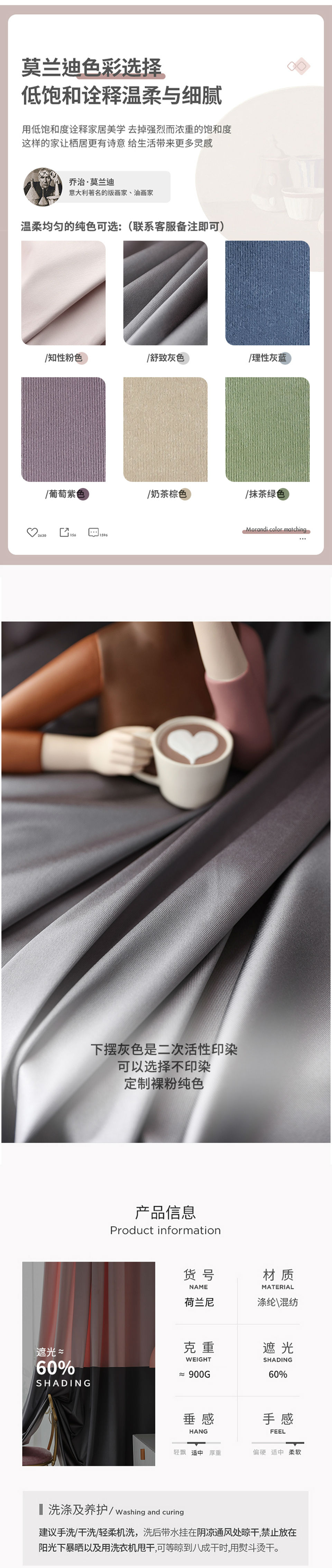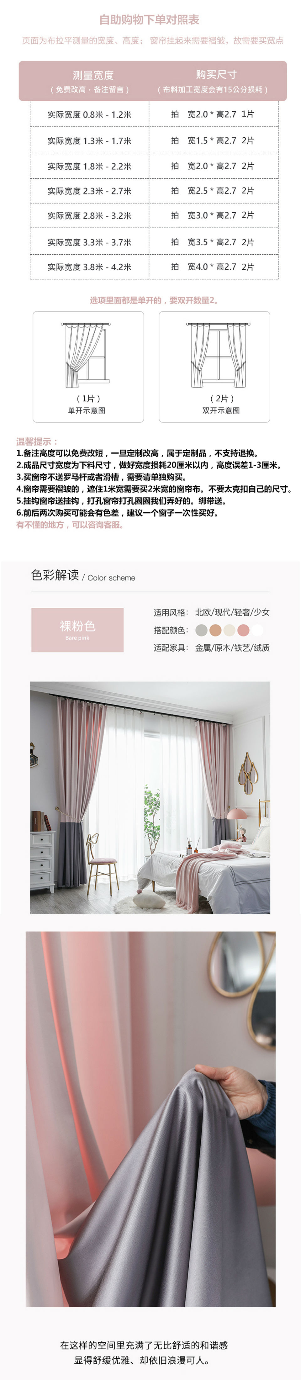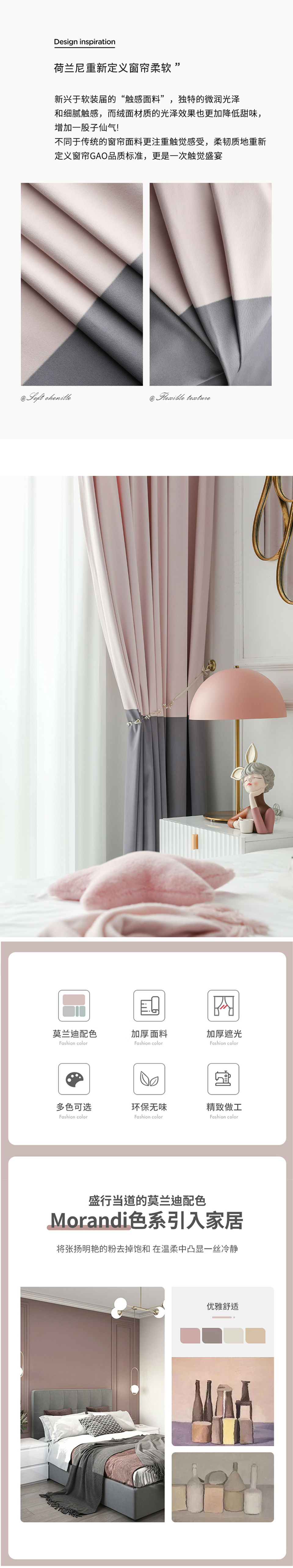 商品名称:4法式窗帘粉灰色奶茶纯色拼色渐变仿羊绒雪尼尔绒布少女轻奢风ins
