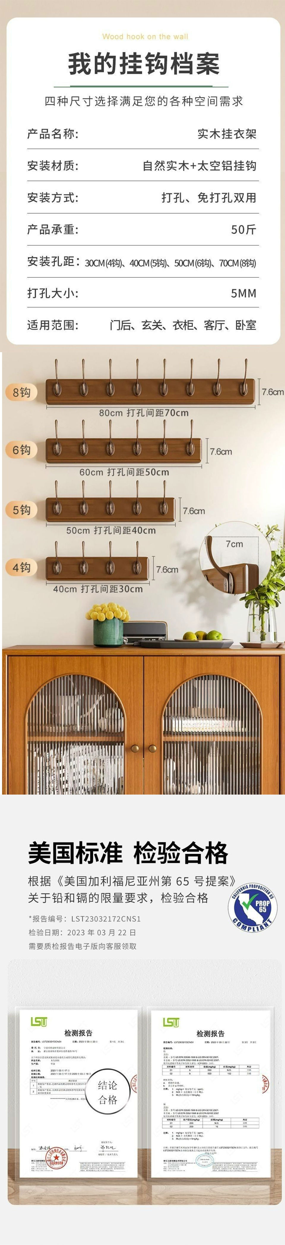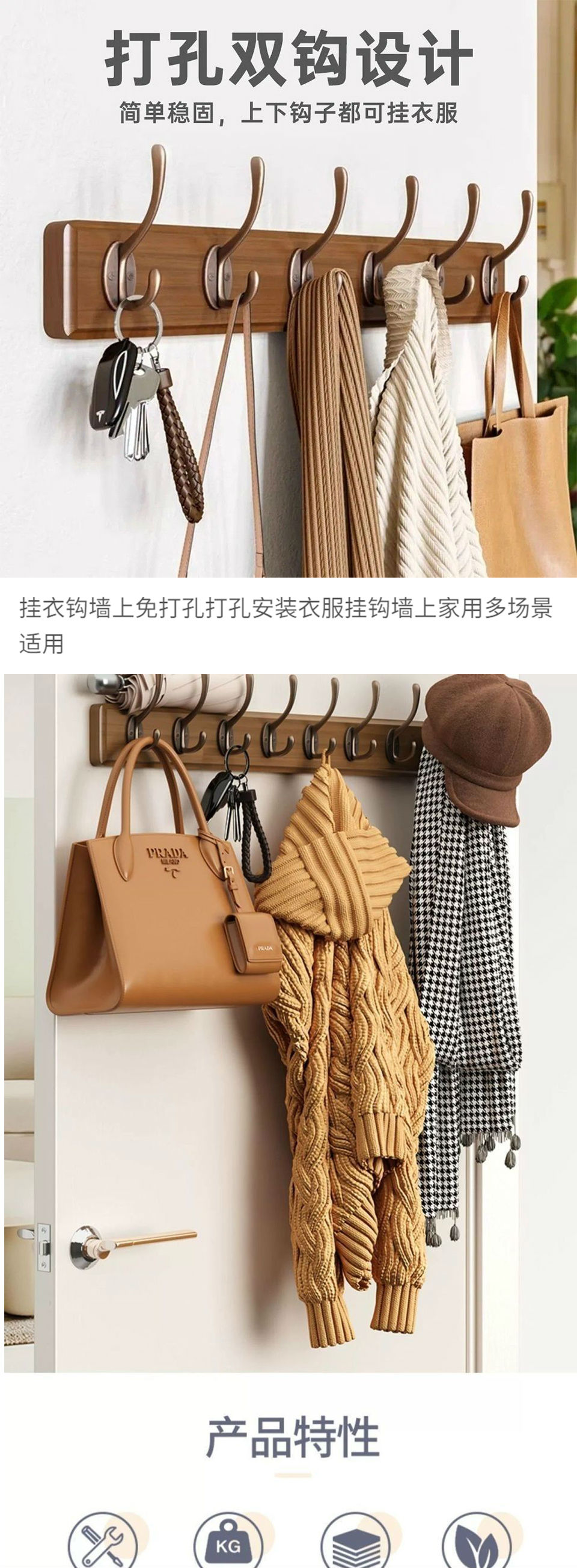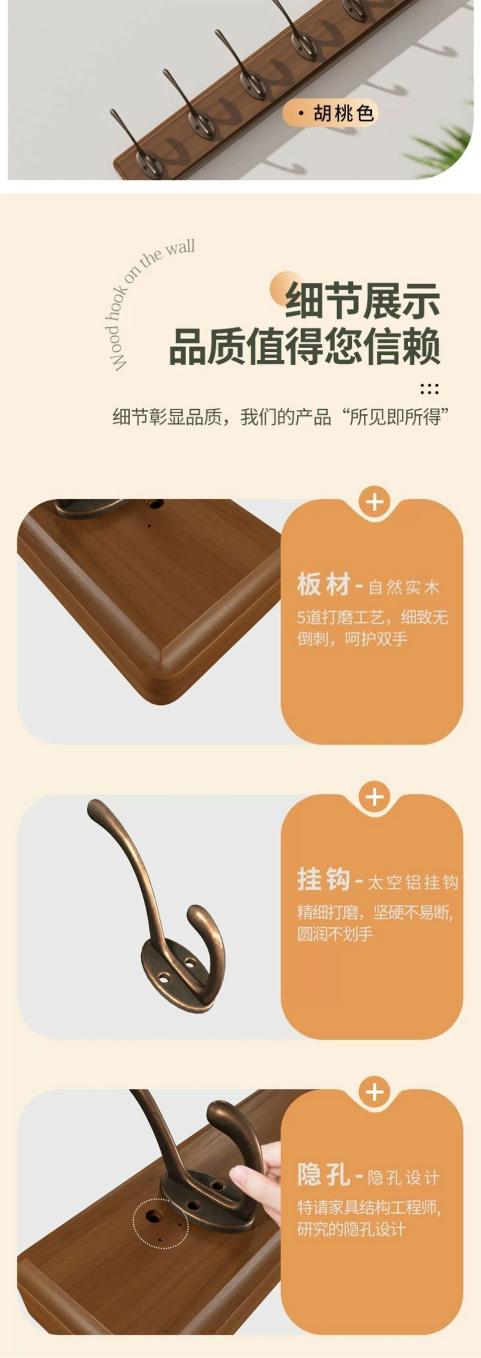 胡桃色实木6钩上下可挂