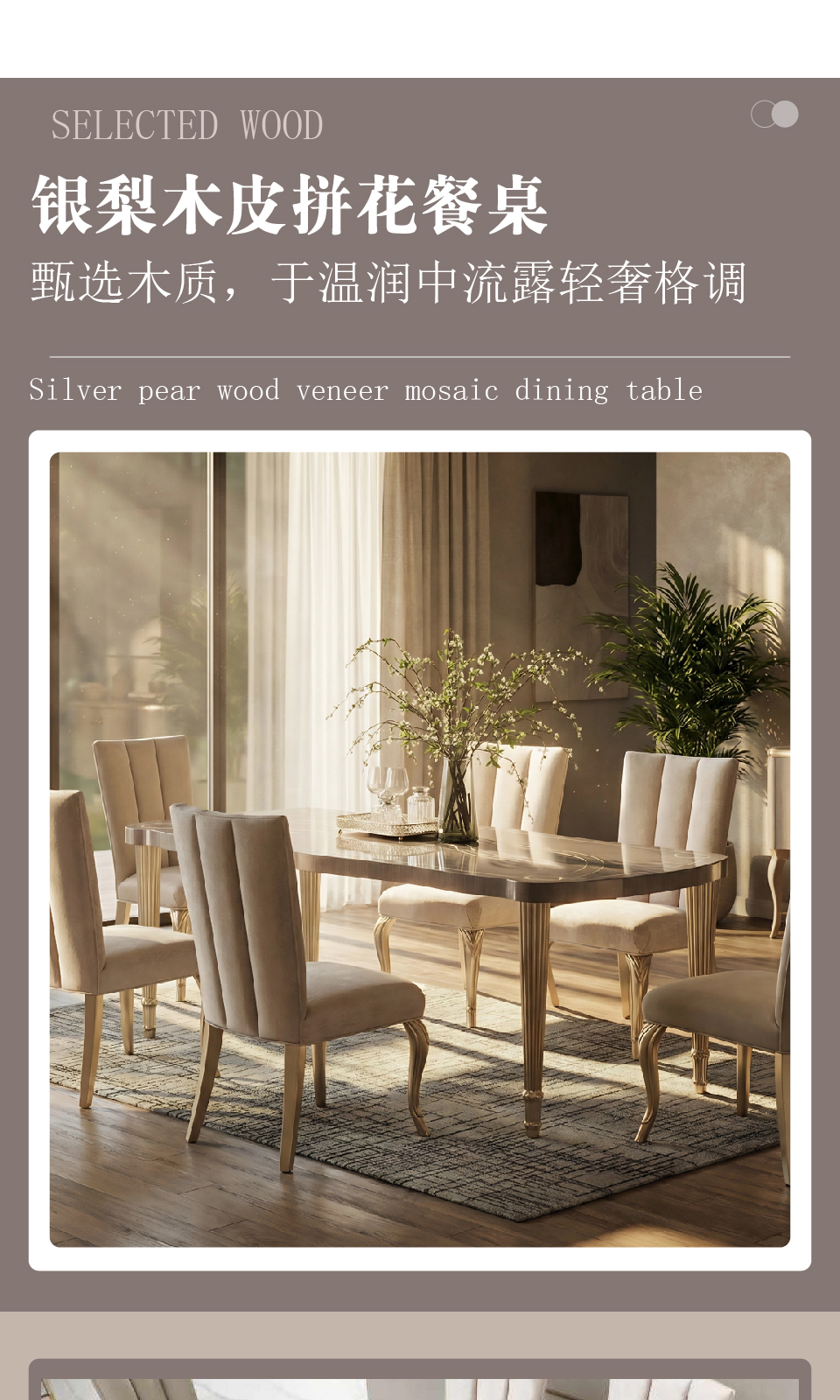 商品名称:欧式风格 2.1米长餐台 银梨木皮拼花餐桌 MA-710长餐台+MA-811餐椅