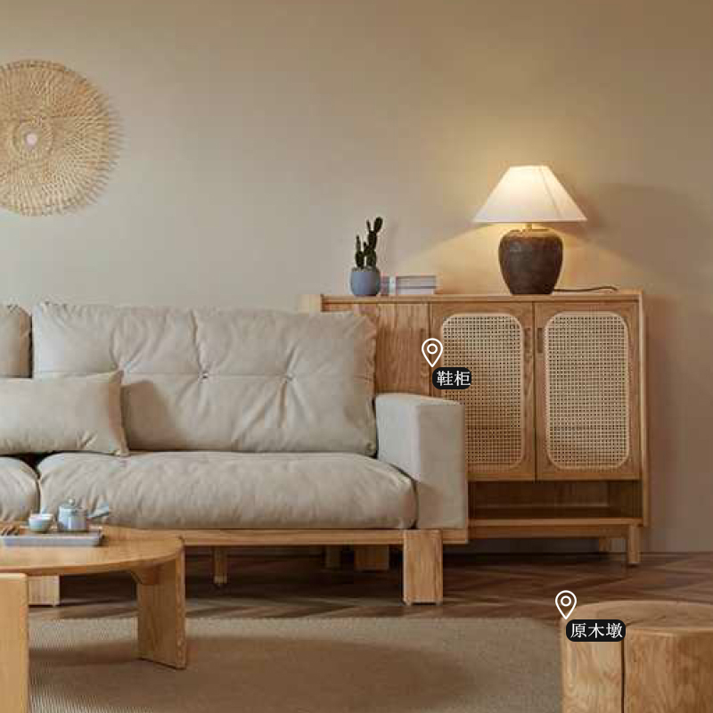 商品名称:北欧直排沙发 进口白蜡木云朵沙发 科技布直排沙发 原木风圆几