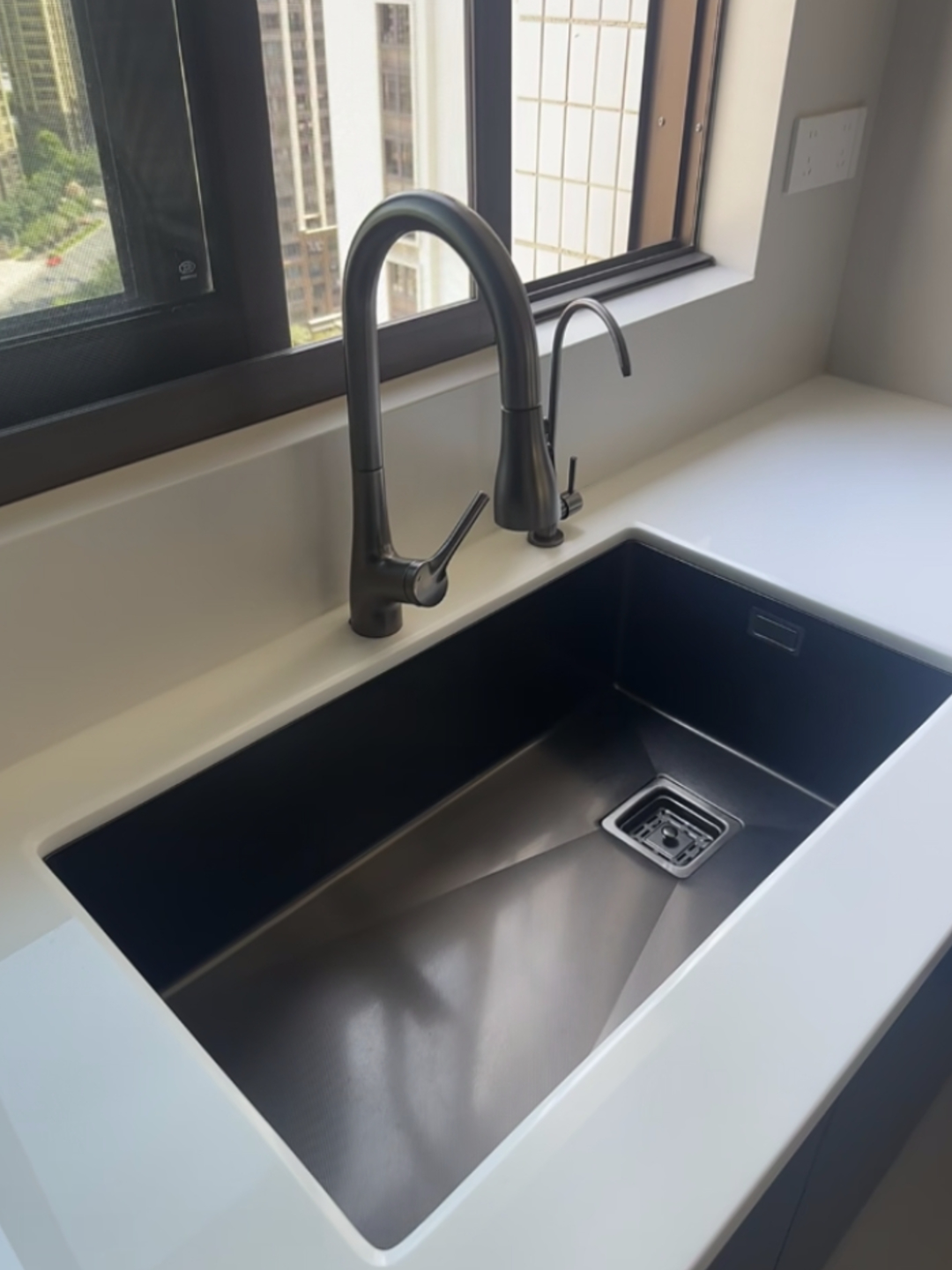 双槽看似实用,实则空间被分割,洗大锅、大砧板时根本放不开,还容易藏污纳垢。大单槽的空间足够宽敞,锅碗瓢盆、甚至整个砧板都能直接放进去清洗,水渍不会溅到外面,清洁起来一目了然。搭配一个可伸缩的水龙头,冲洗无死角,厨房劳作效率直接翻倍。