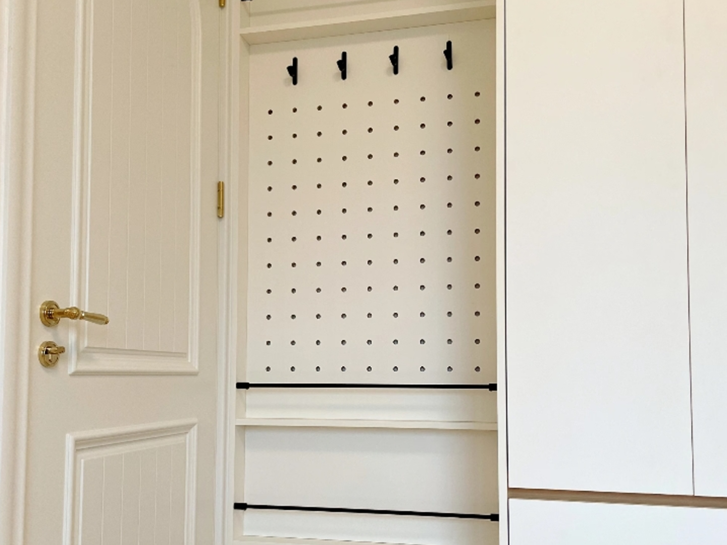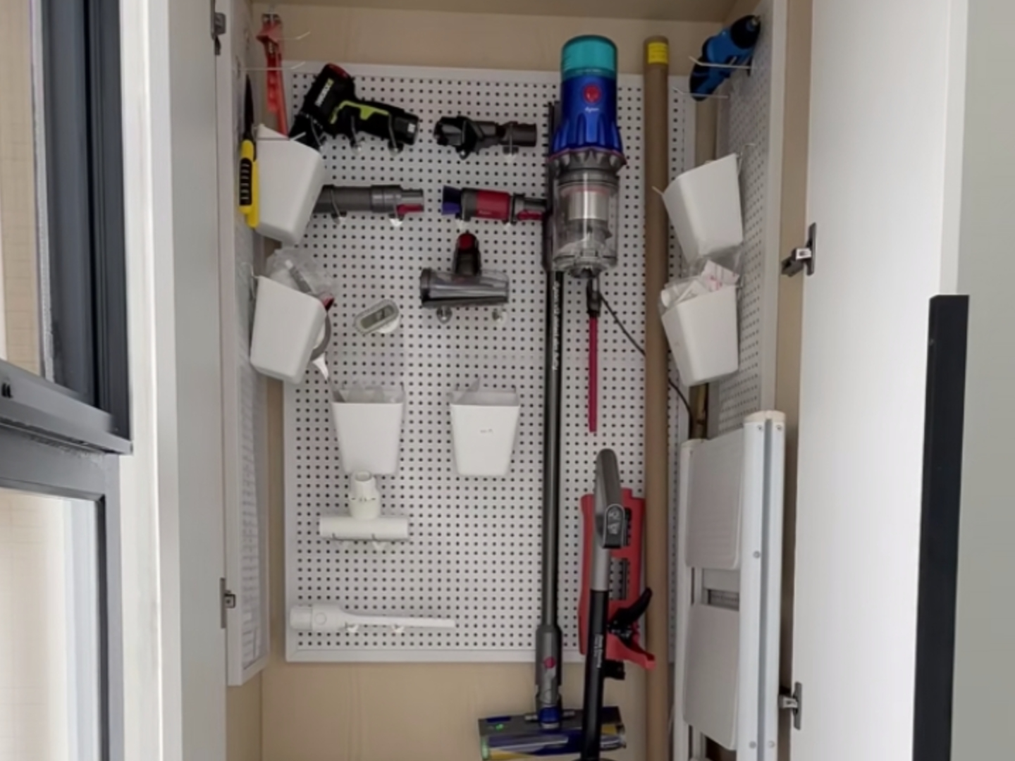 扫把、拖把、吸尘器配件东倒西歪,放在阳台显乱、放卫生间受潮?建议在阳台、卫生间角落或玄关处,预留一个 60×40×180cm 的窄柜,内部装上洞洞板。