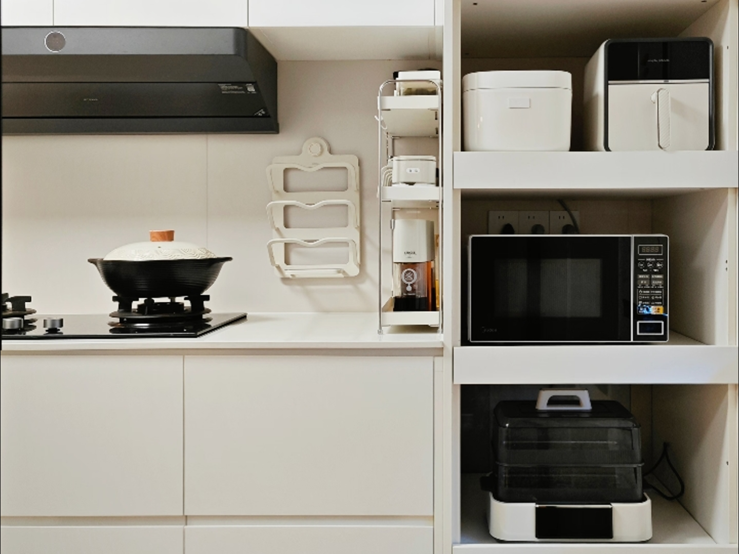 把常用的小家电收进去,台面只留必要的厨具,不仅整洁美观,还能避免电器积灰,做饭时操作更顺畅,小户型厨房瞬间“扩容”!
