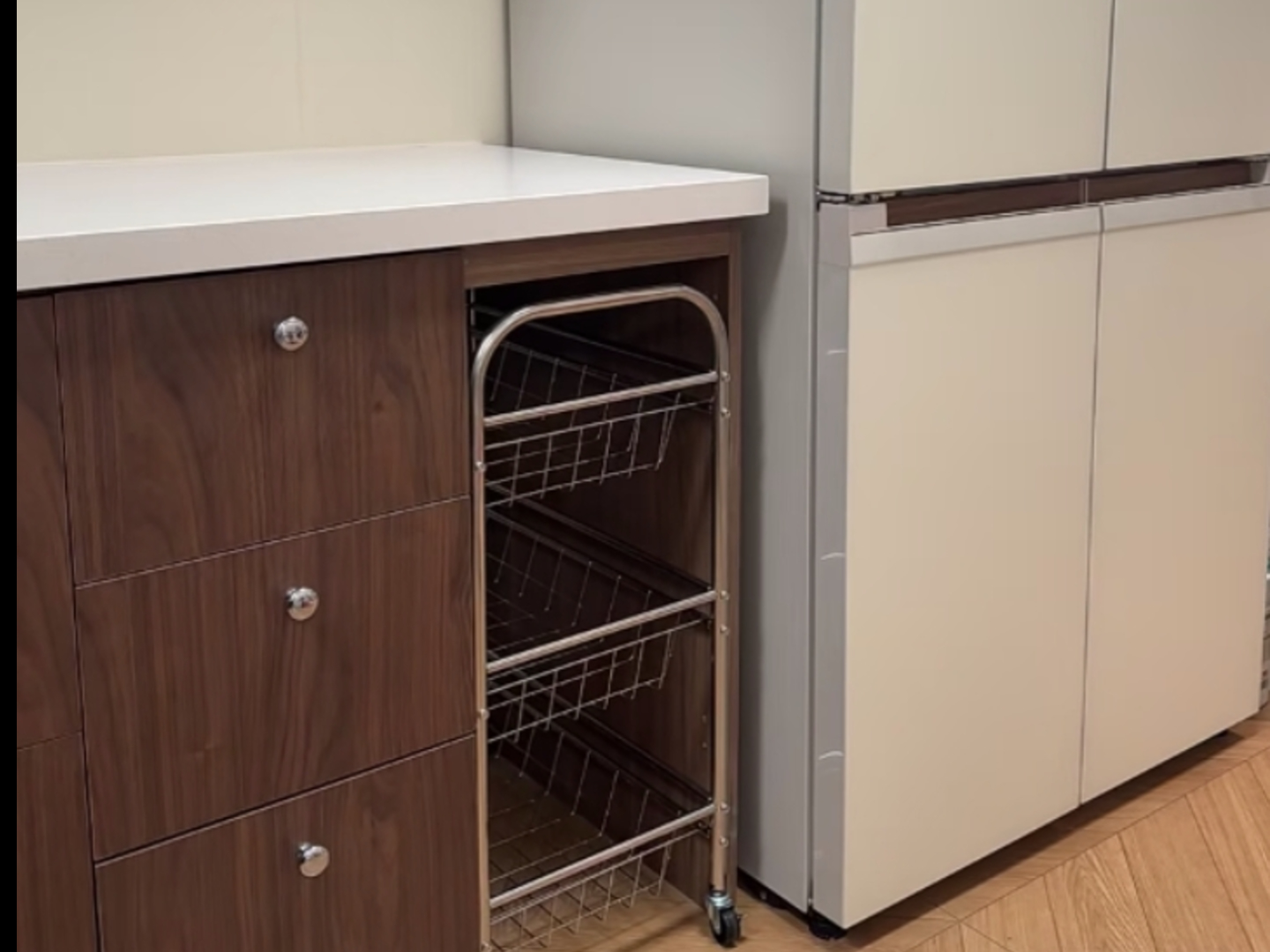 土豆、洋葱、大蒜、南瓜这些不需要冷藏的蔬果,塞冰箱占地方,放台面又凌乱?在冰箱旁边预留一个 30×44×67cm 的空隙,放一个多层小推车。