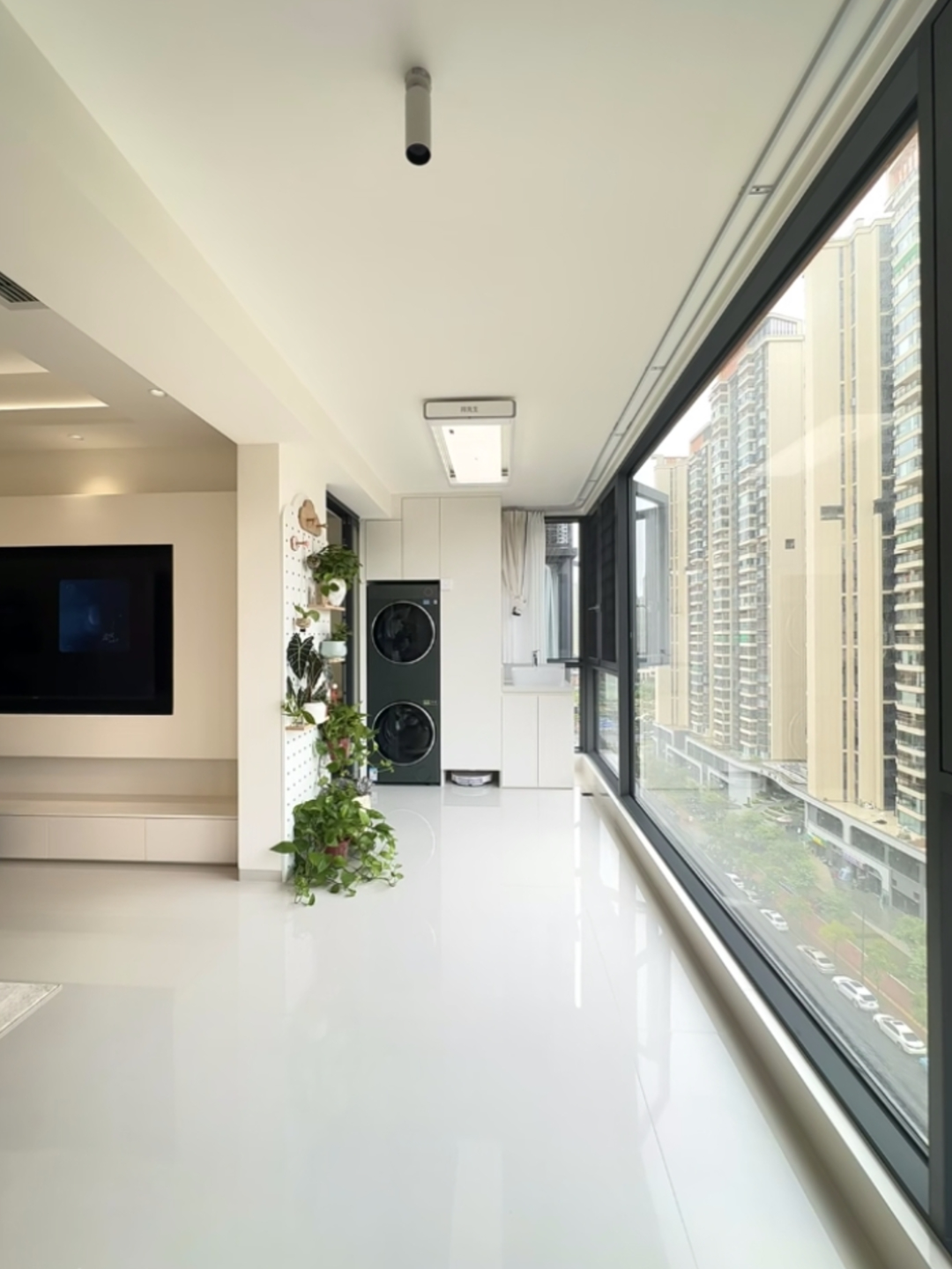 没有了推拉门的阻隔,客厅的采光直接翻倍,阳光能毫无遮挡地洒满全屋;视觉上两个空间融为一体,原本不算大的客厅瞬间显得宽敞开阔。更重要的是,阳台不再是“晾衣专属区”,摆上休闲椅就是小茶座,放上收纳柜就是杂物储藏间,利用率直接拉满。