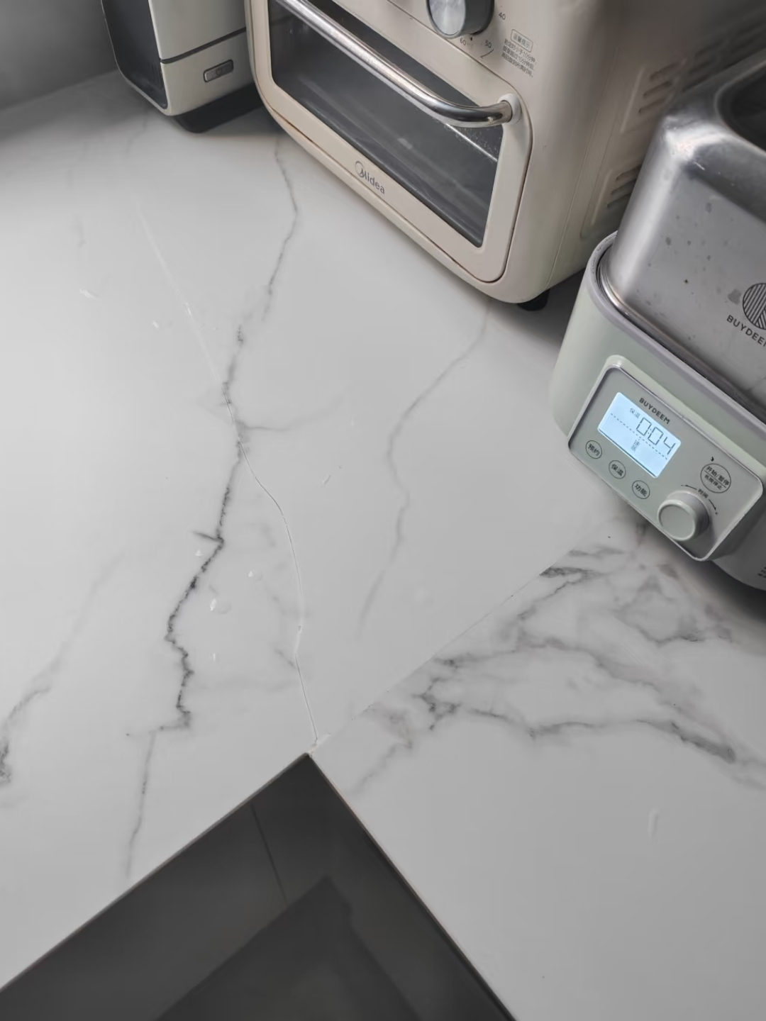 岩板台面虽颜值能打,但脆得像“玻璃”——锅具轻轻一碰就可能开裂,后续维修又费钱又麻烦,清洁时还得小心翼翼“伺候”。