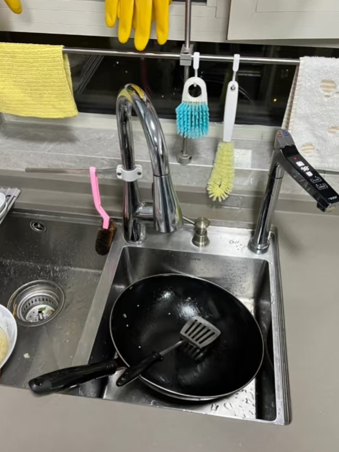 小双槽看似“分工明确”,实则空间局促,大一点的锅具根本放不下,洗刷时水渍还溅得一身;台上盆的接缝处更是“藏污纳垢重灾区”,长期使用容易发霉发黑,清理起来超费劲。