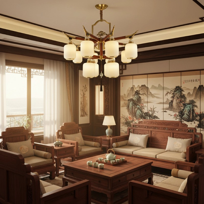 商品名称:107新中式吊灯客厅灯锌合金红木灯具中国风大气实木吊灯餐厅灯封口罩