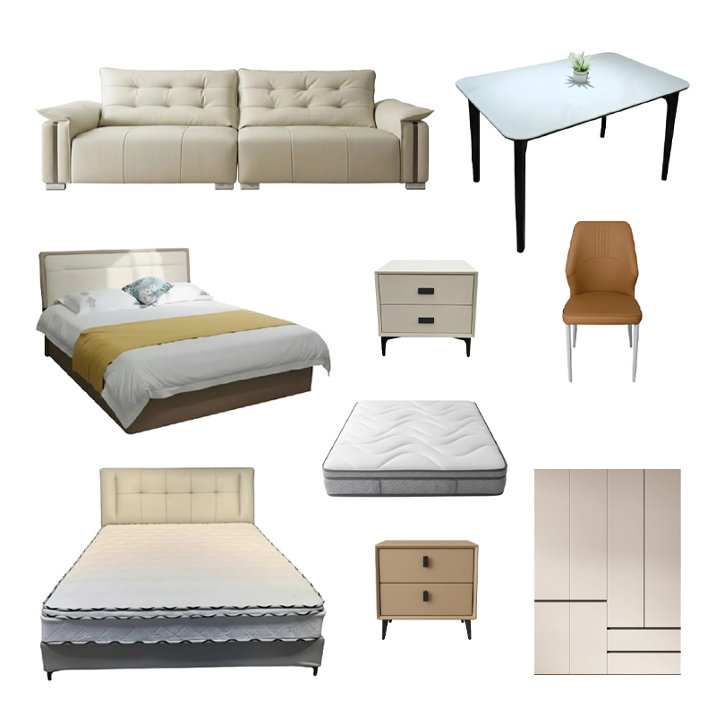 现代家具套餐 两室一厅现代家具套餐15件 2床+4床头柜+1衣柜+2床垫 1桌+4椅 直排沙发 客厅餐厅卧室家具组合