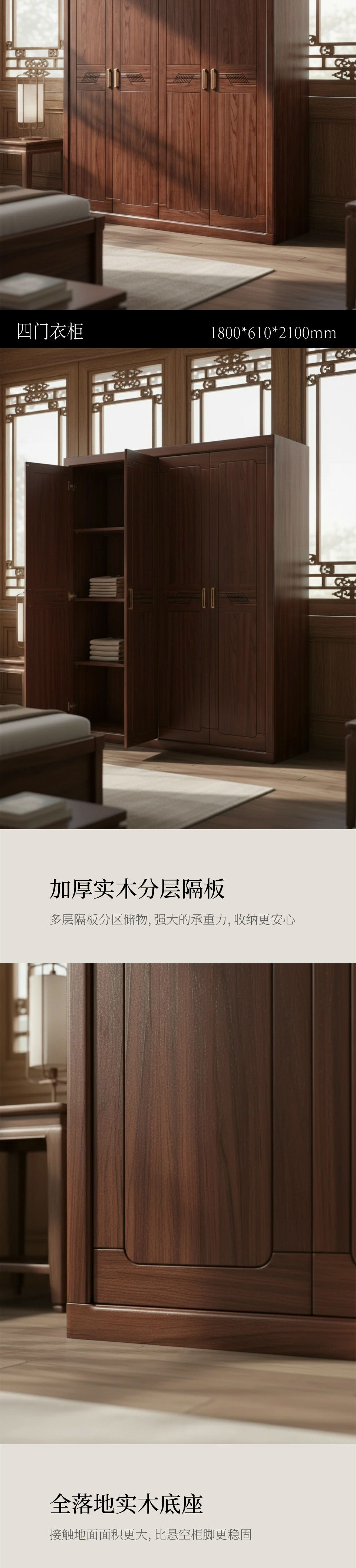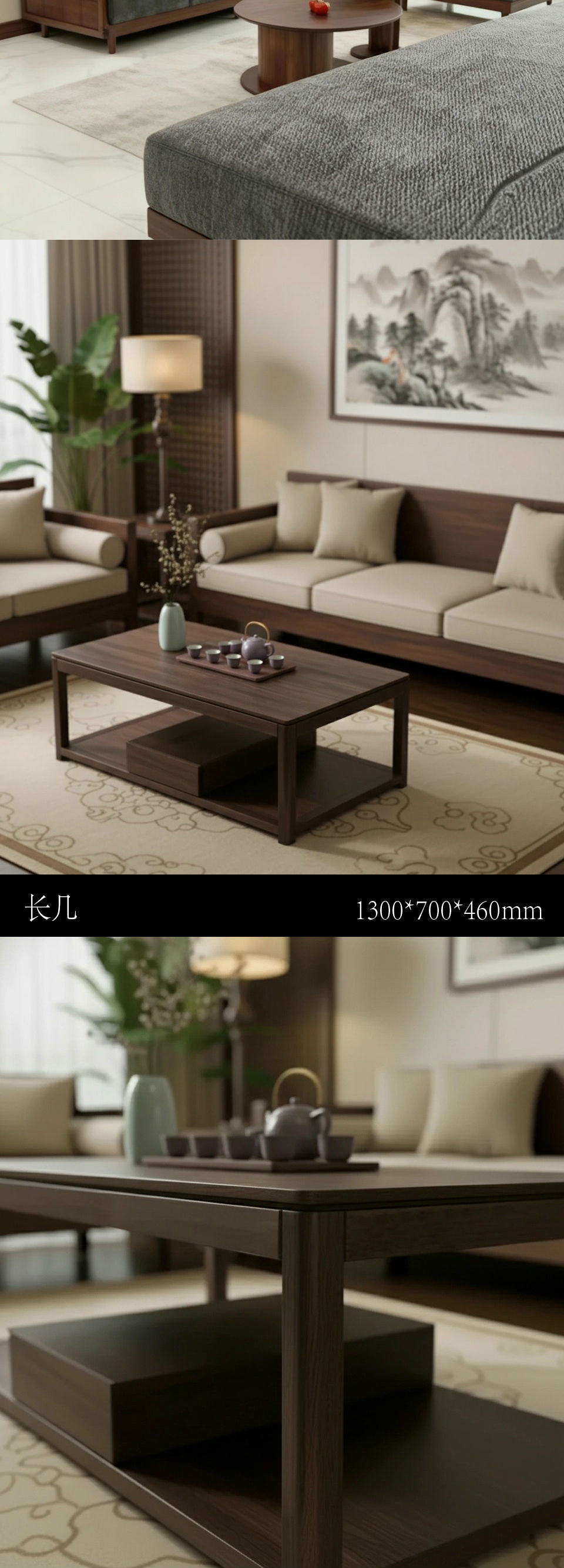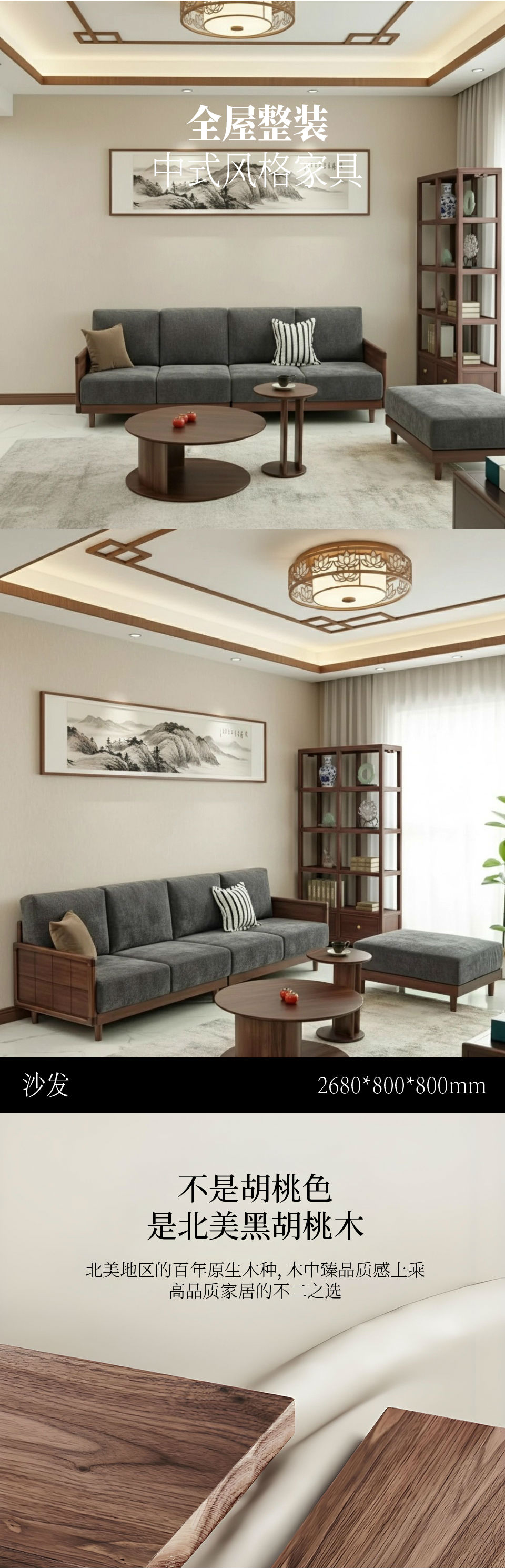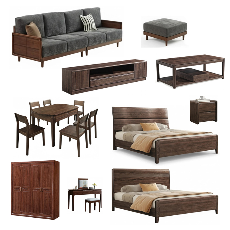 商品名称:中式套餐1 两室两厅家具套餐17件套 黑胡桃中式客厅直排沙发 卧室2床+4床头柜 妆台 衣柜 餐厅1桌4椅