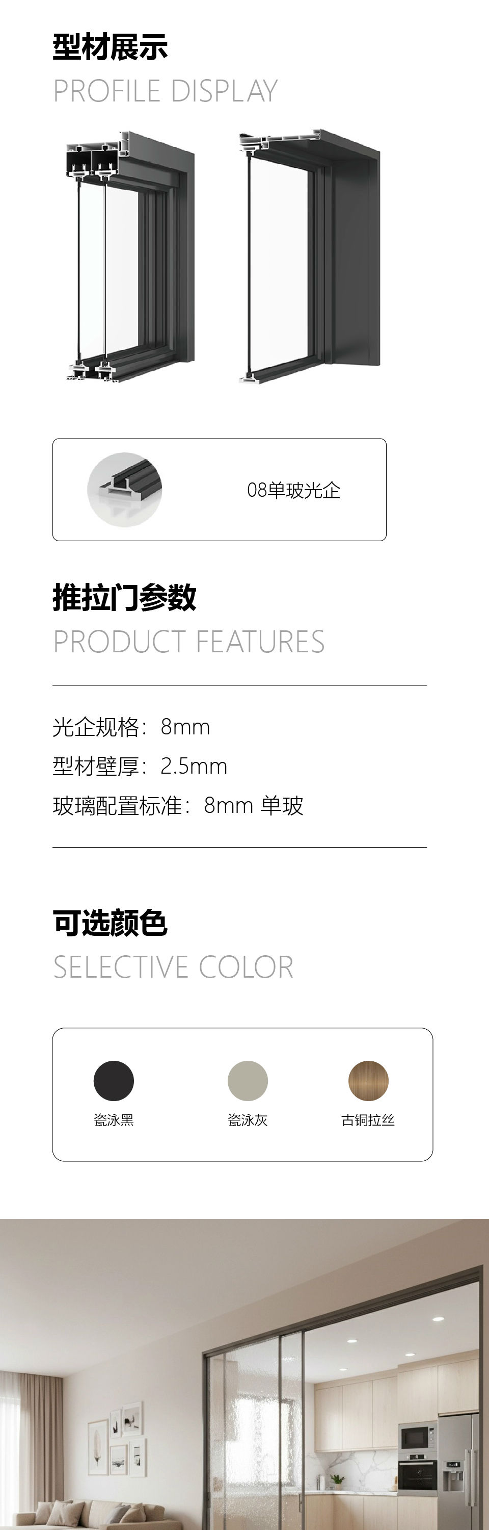 ORK-8023+ORK-8026 08*45推拉门 极窄边框玻璃门 8mm单玻壁厚2.5mm厨房推拉门
