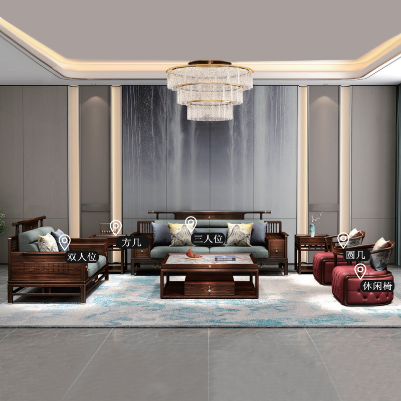 商品名称:新中式黑檀木123沙发组合,棉麻布实木沙发,扶手储物沙发,实木休闲椅,实木方几,实木圆几
